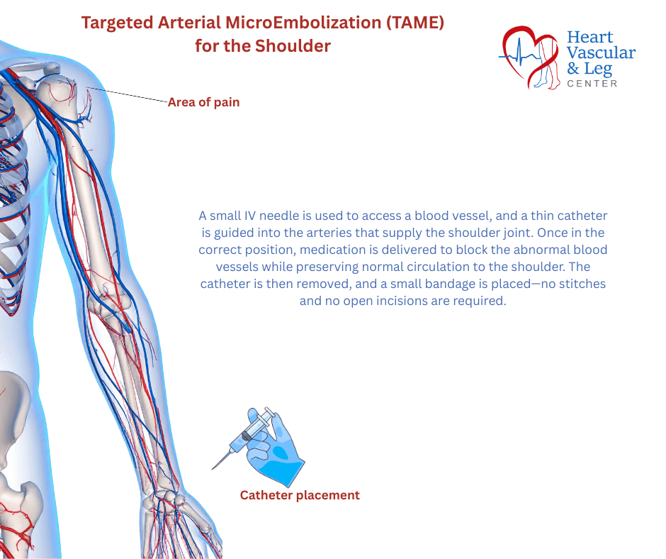 At Heart, Vascular & Leg Center, treatment focuses on relieving pain, restoring mobility, and addressing both structural and vascular causes of shoulder discomfort. Your personalized care plan may include: